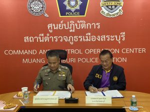 พล.ต.ต.ธรรมนูญ เชาวะวนิชย์ ผบก.ภ.จว.สระบุรี พ.ต.อ.สมคิด สาวิสัย รอง ผบก.ภ.จว.สระบุรี พ.ต.อ.สุริยะ สุดกังวาล ผกก.สภ.เมืองสระบุรี พ.ต.ท.สิทธิเดช เรืองสม รอง ผกก.จร.สภ.เมืองสระบุรี พ.ต.ท.รตา บุญนำมา สว.จร.สภ.เมืองสระบุรี นายสมพงษ์ สุเมธาธิกุล ขนส่งจังหวัดสระบุรี ได้ทำบันทึกข้อตกลงความร่วมมือการจัดสรรเงินกองทุนเพื่อความปลอดภัยในการใช้รถใช้ถนนสำหรับดำเนินโครงการด้านความปลอดภัยทางถนนในระดับจังหวัด ระหว่างกรมการขนส่งทางบก โดยสำนักงานขนส่งจังหวัดสระบุรี และตำรวจภูธรภาค 1 โดยตำรวจภูธรจังหวัดสระบุรี เพื่อดำเนินการฝึกอบรมสมาชิกอาสาจราจร ในเขตพื้นที่อำเภอเมืองสระบุรี จำนวน 120 คน สร้างเครือข่ายเพื่อสนับสนุนการป้องกันการเกิดอุบัติเหตุ และลดอัตราการเสียชีวิตจากรถจักรยานยนต์ สอดคล้องกับยุทธศาสตร์ กลยุทธ์ เป้าหมายหลัก กรอบทิศทาง และตัวชี้วัดของกองทุนเพื่อความปลอดภัยในการใช้รถใช้ถนน ส่วนกำหนดการฝึกอบรมจะแจ้งให้ทราบในคราวต่อไป