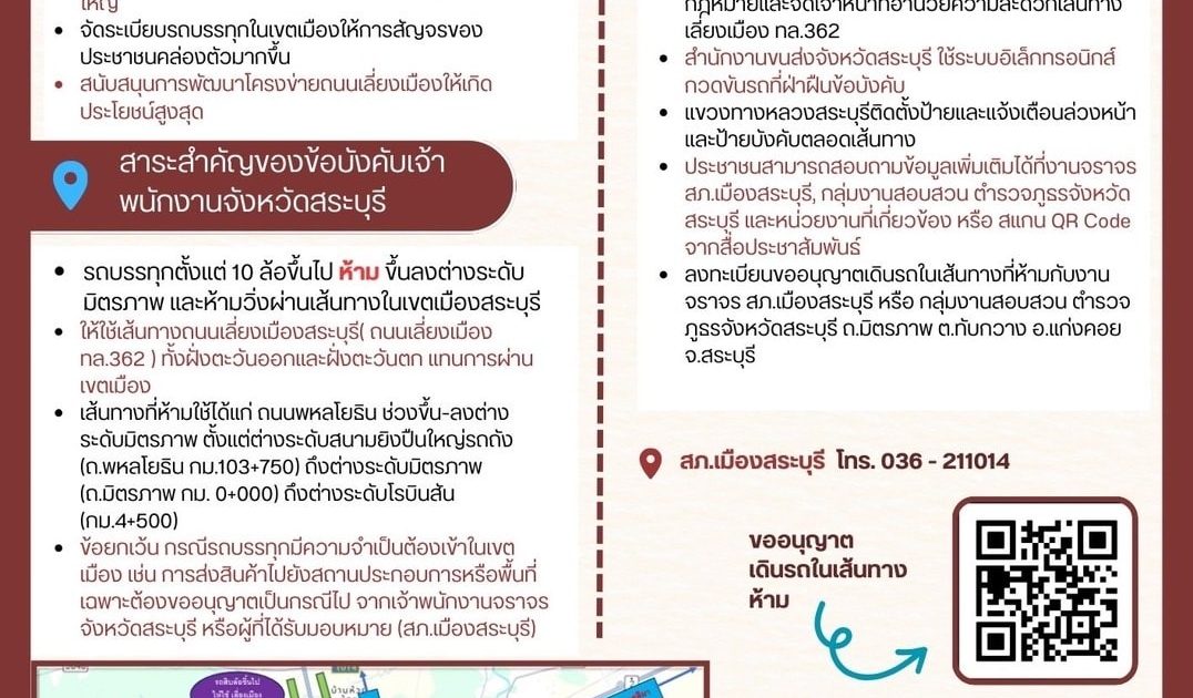 ประชาสัมพันธ์ห้ามรถบรรทุก 10 ล้อขึ้นไปขึ้นต่างระดับมิตรภาพ ให้ใช้ทางเลี่ยงเมืองสระบุรี ตามข้อบังคับเจ้าพนักงานจราจรจังหวัดสระบุรี ลง 31 ก.ค.68 ประกาศมีผลบังคับใช้ตั้งแต่วันที่ 1 กันยายน 2568 เป็นต้นไป
