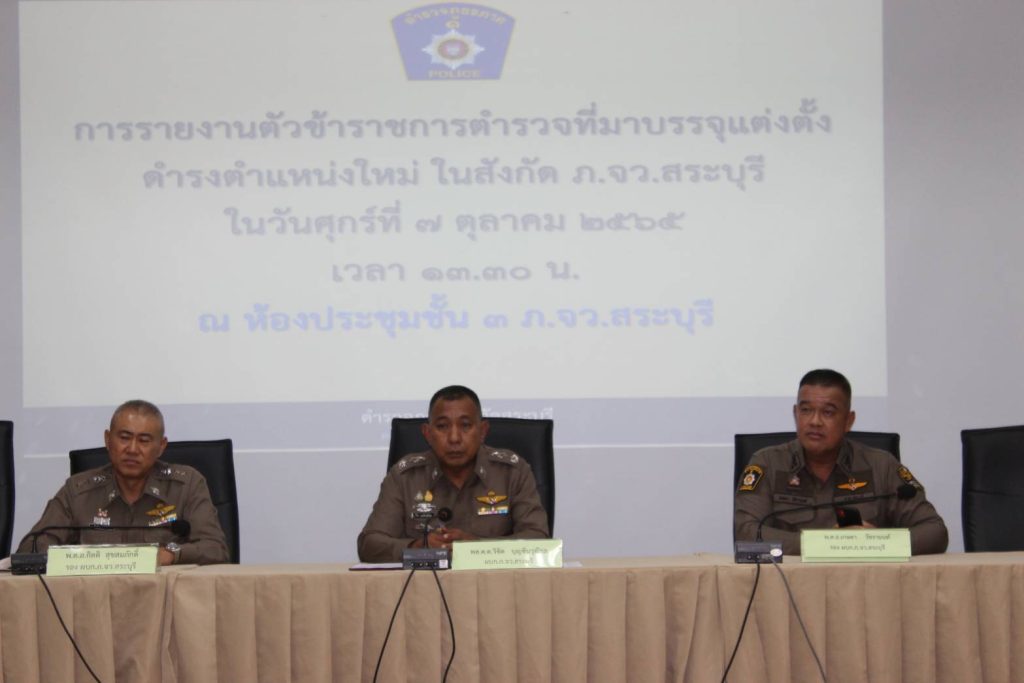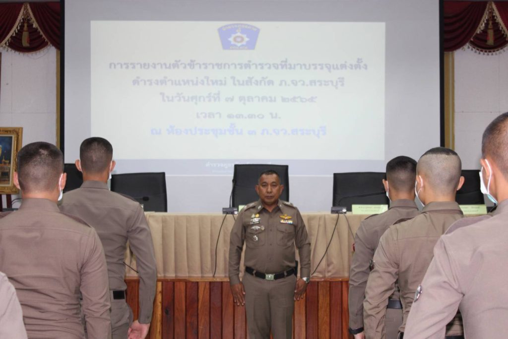 วันนึ้(7 ต.ค 65) เวลา 13.30 น. พล.ต.ต.วิชิต บุญชินวุฒิกุล ผบก.ภ.จว.สระบุรี พ.ต.อ.กิตติ สุขสมภักดิ์ รอง ผบก.ภ.จว.สระบุรี และพ.ต.อ.เกษดา วัชรานนท์ รอง ผบก.ภ.จว.สระบุรี ผกก.ฝอ.ภ.จว.สระบุรี สว.ฝอ.ภ.จว.สระบุรี ข้าราชการตำรวจที่สำเร็จการฝึกอบรมหลักสูตร นสต. ประจำปี 2565 จำนวน 60 นาย ร่วมพิธีรายงานตัวข้าราชการตำรวจบรรจุแต่งตั้งมาดำรงตำแหน่งในสังกัด ภ.จว.สระบุรี ณ ห้องประชุม ชั้น 3 ภ.จว.สระบุรี
